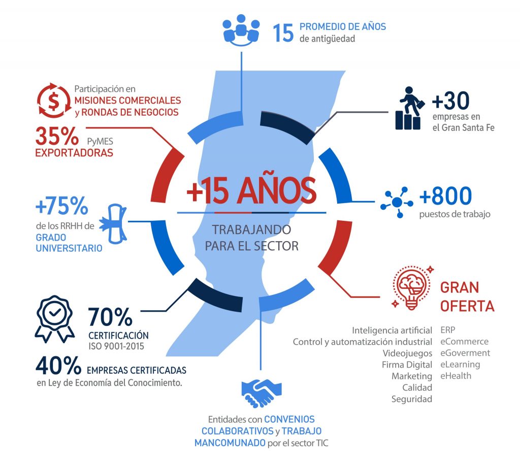 The “Civil Association CLUSTER TIC Santa Fe” was established with the aim of aligning the individual efforts of its member companies to achieve greater competitiveness both individually and collectively. The goal is to gain recognition as a regional benchmark in the information and communication technology sector, improving the sustainability of each firm through collaborative work to consolidate more competitive companies, all interested in the region’s growth.